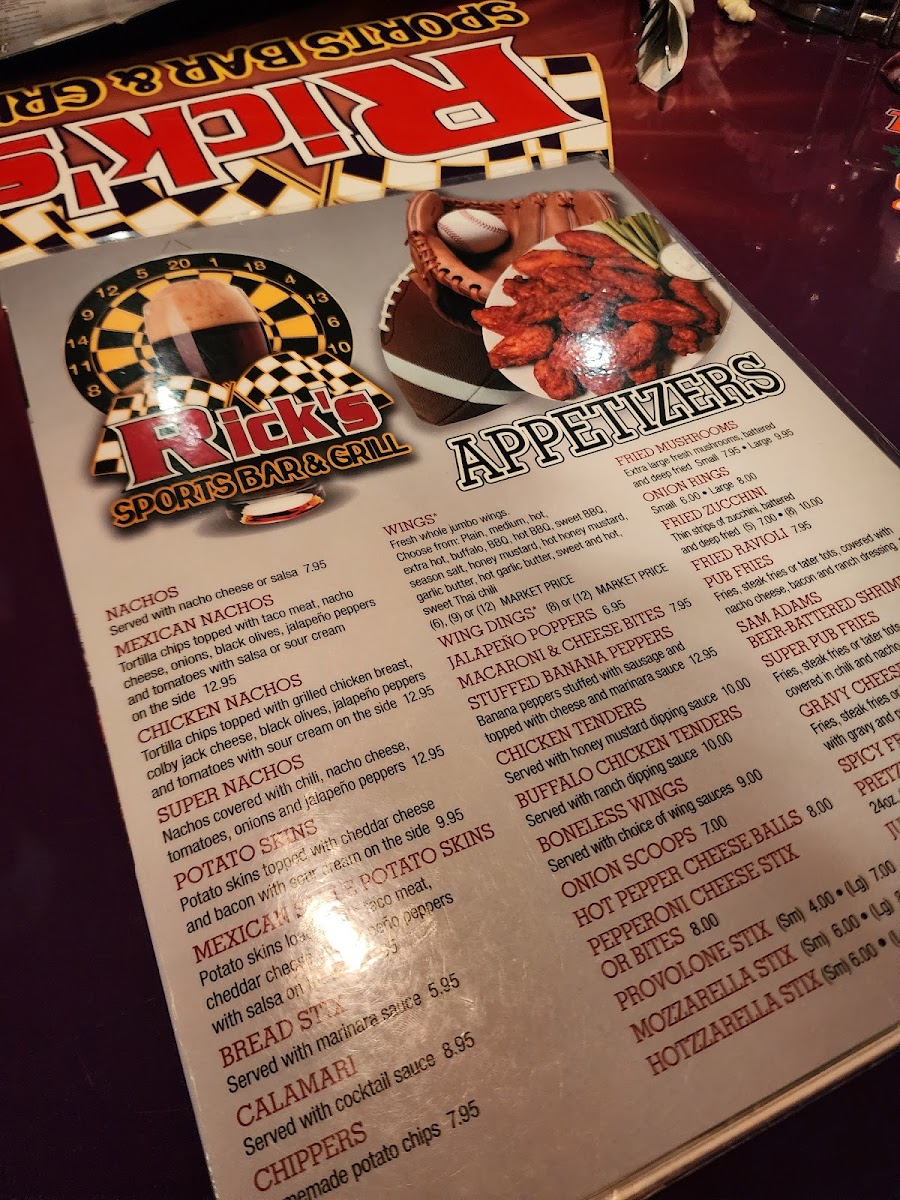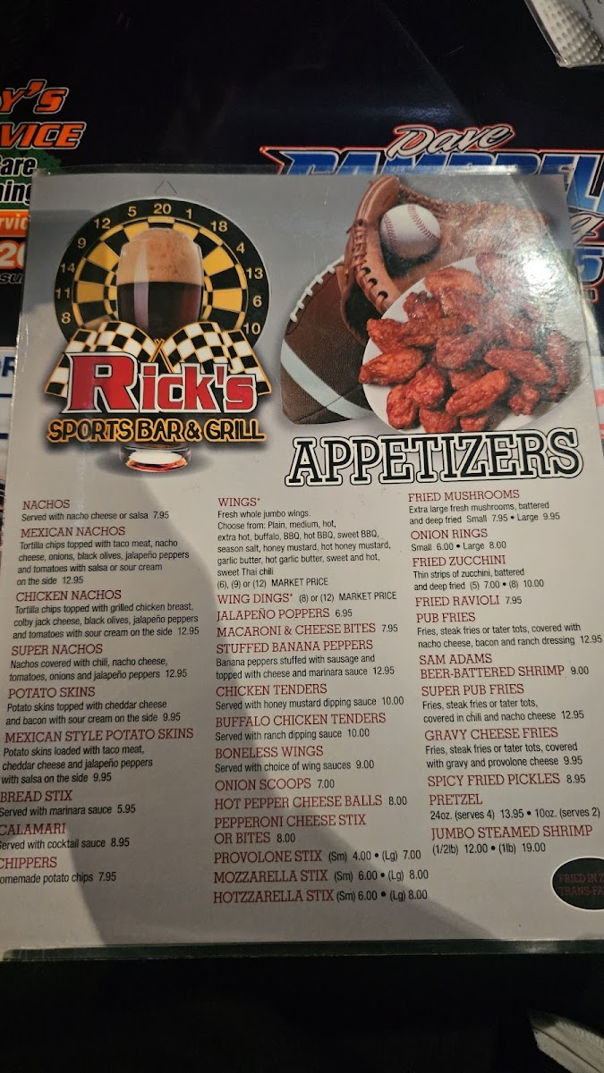 The menu at Ricks Sports Bar & Grill offers a straightforward, comforting selection of casual bites and drinks designed to complement its inviting, laid-back atmosphere. Whether you're settling in for a game, catching up with friends, or enjoying a relaxed family outing, you’ll find satisfying options to match the mood.
